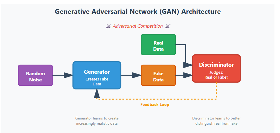 How They Work: GANs operate through an adversarial process involving two neural networks, a Generator and a Discriminator, locked in continuous competition. The Generator creates synthetic data attempting to fool the Discriminator, while the Discriminator evaluates whether data is real or fake. Through repeated cycles, the Generator becomes increasingly skilled at producing realistic outputs.