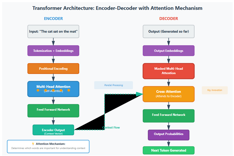 Transformers revolutionized AI through their “attention mechanism,” which determines relationships and relevance between different parts of input data. They process sequential data (particularly text) by understanding context and meaning, transforming input sequences into output sequences. Key components include encoder-decoder structures, multi-head attention, position encoding, and feed-forward networks.