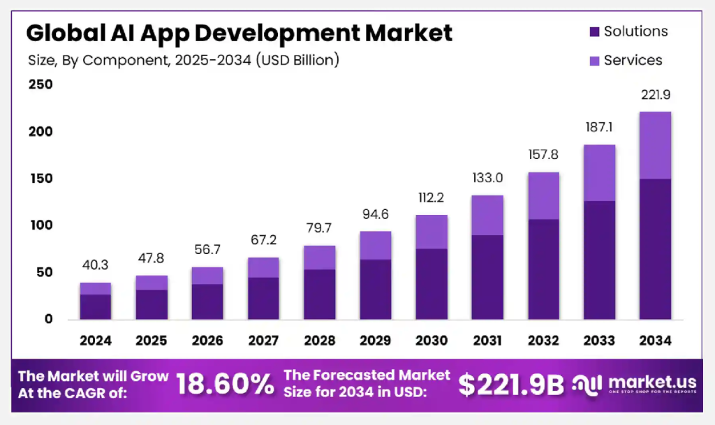 AI in mobile apps is growing even faster. The market will go from USD 21.23 billion in 2024 to USD 354.09 billion by 2034—a 32.5% annual growth rate.