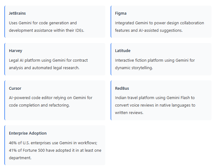 Gemini attracts companies that need on-device processing for privacy-sensitive work (finance, healthcare, legal) or those already embedded in Google’s ecosystem. Its speed and real-time capabilities also appeal to companies building consumer-facing mobile apps.