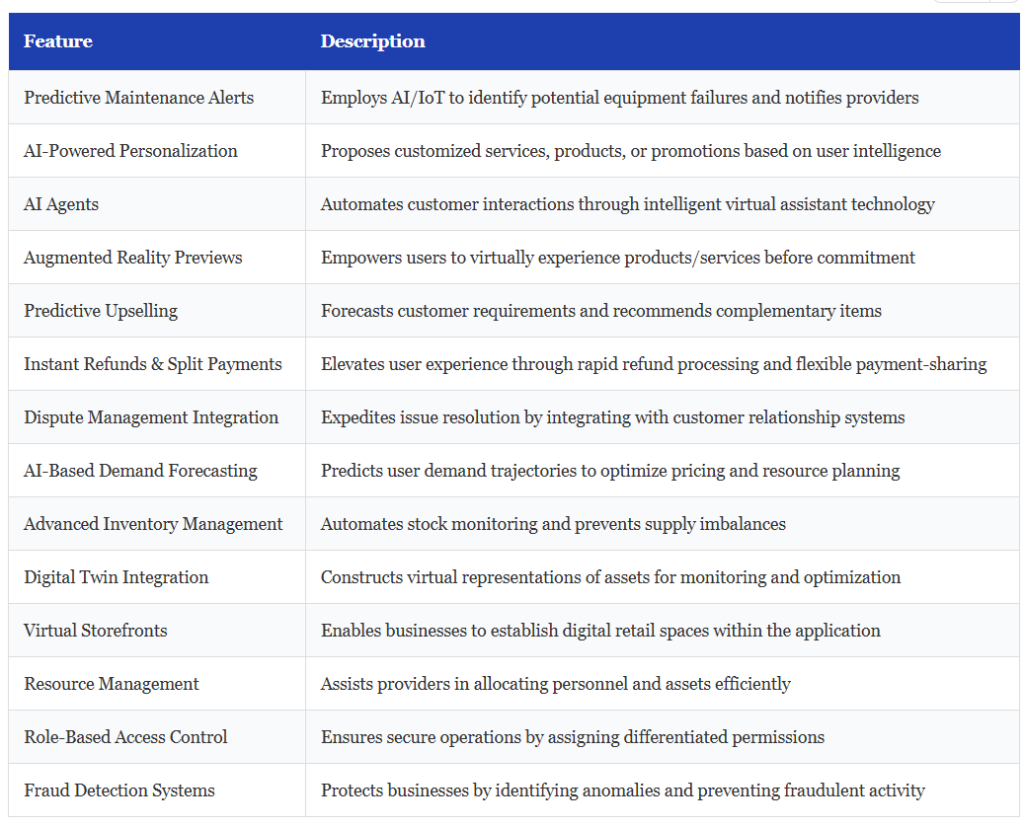Advanced capabilities may incorporate AI-driven personalization engines, intelligent virtual assistants, immersive reality previews, predictive cross-selling, instant refund processing with payment distribution, and various other sophisticated features. Together, these capabilities establish comprehensive, user-centric, and competitive on-demand platforms.