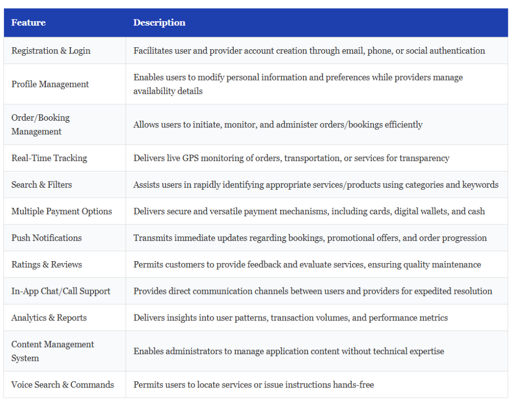 Every on-demand application requires foundational capabilities to guarantee frictionless user experiences and operational effectiveness. Core functionalities include identity verification systems, profile administration, transaction management, live tracking, search capabilities, diverse payment integration, and numerous others.