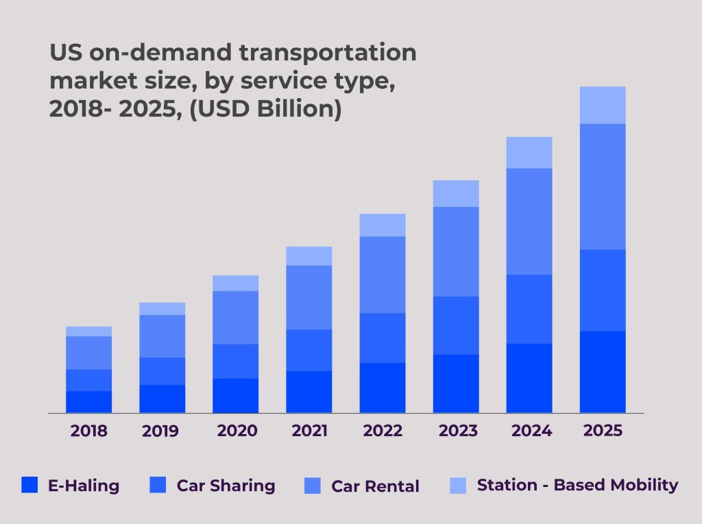 According to research, the market size of the on-demand transportation market size is anticipated to expand at CAGR of 19.8% from 2018 to 2025.