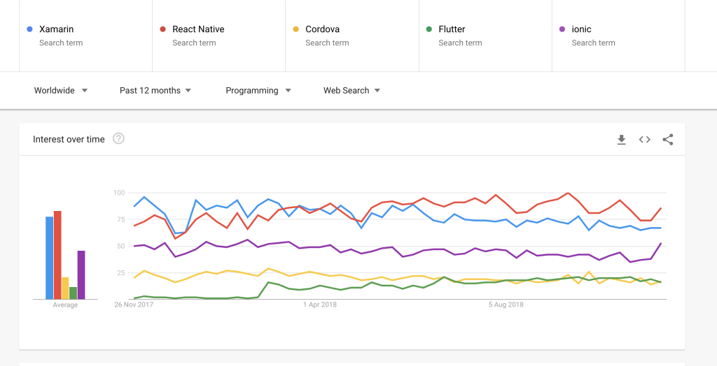Take a look at this graph showing the different mobile app development frameworks and their popularity over time to understand the acceptance of React Native.