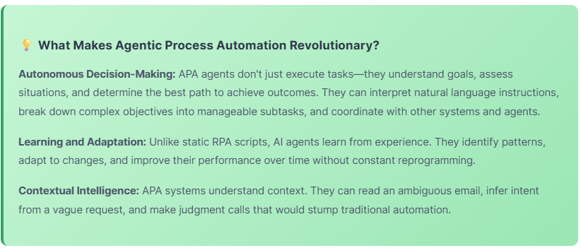Agentic Process Automation represents a quantum leap in automation technology. Instead of following rigid scripts, APA systems employ AI agents—autonomous digital workers powered by large language models (LLMs), machine learning, and advanced decision-making algorithms.