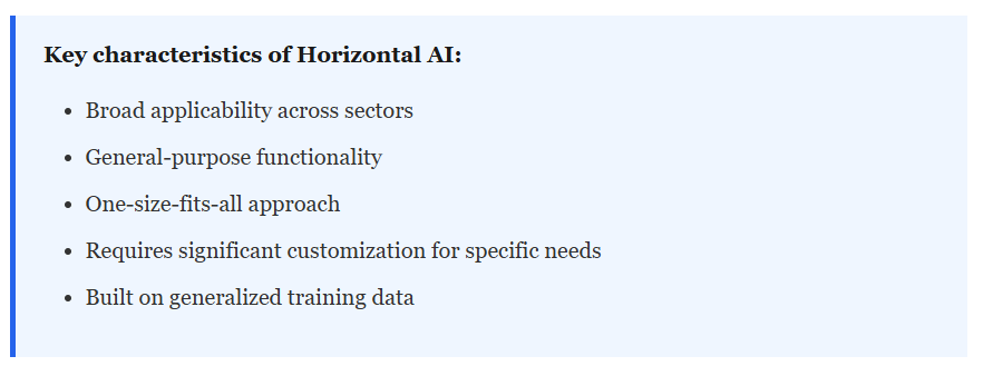 Horizontal AI is trained on broad, general datasets. When applied to specific industries, it often lacks the nuanced understanding that comes from training on domain-specific data.
