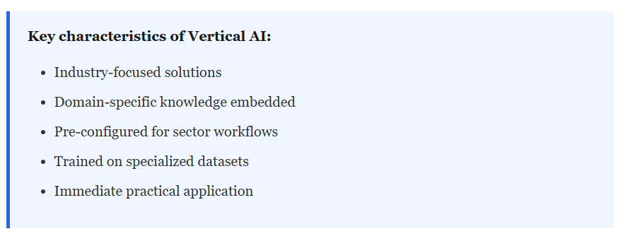 Vertical AI, on the other hand, is purpose-built for specific industries or domains. These models are trained on industry-specific data, understand sector-specific terminology, and are optimized for particular workflows and challenges unique to that vertical.